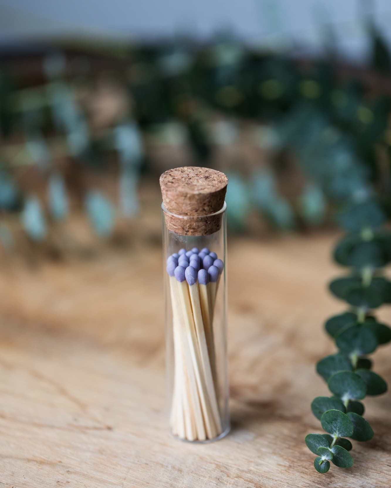 - 31 x 3" lilac-tipped wood matches in a glass vessel with cork top